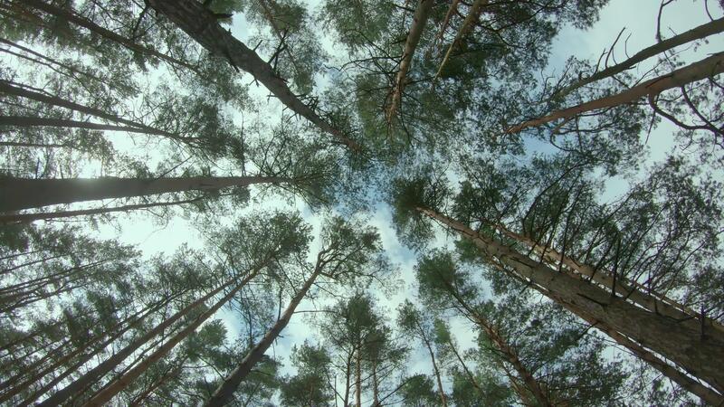 Low Angle View of a Pine Forest when Looking Up to the Trees. Bottom View of Pine Crowns at Sunny Summer Day. The Sky Can Be Seen Through the Tops of the Trees. Forward Gimbal Stabilizer Movement Pro Video