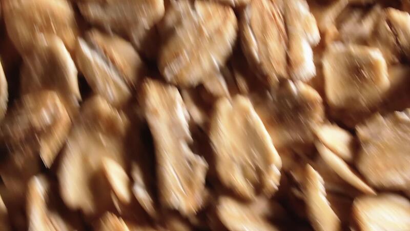 Oat Flakes Background Rotating Counter-Clockwise - Top View, Close-Up, Low Key Light. Scattered Dry Oat Flakes. Healthy Breakfast and Diet Eating Ingredients - Angular Rotation Left Pro Video