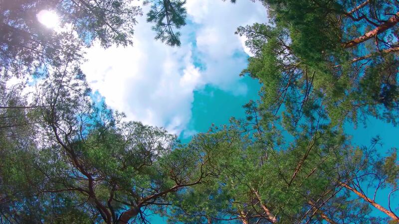 Low Angle View of Colorful Summer Pine Forest, Walking Through the Coniferous Trees - Moving Right. Bottom View of the Tops of Pines at Sunny Summer Day. The Sky Can Be Seen Through the Tops of Pines Pro Video