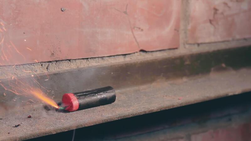 Firecracker Was Lighted Up With a Gas Lighter then Explode Against a Brick Wall. Many Small Particles Flew in a Different Directions - Static Shot Pro Video