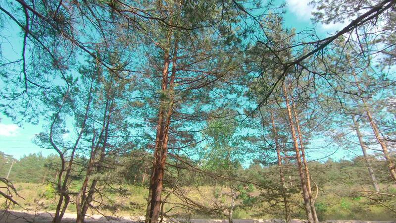 Walking Through the Pine Forest and Looking Up to the Trees. Bottom View of Pine Crowns at Sunny Summer Day. The Sky Can Be Seen Through the Tops of the Trees Pro Video
