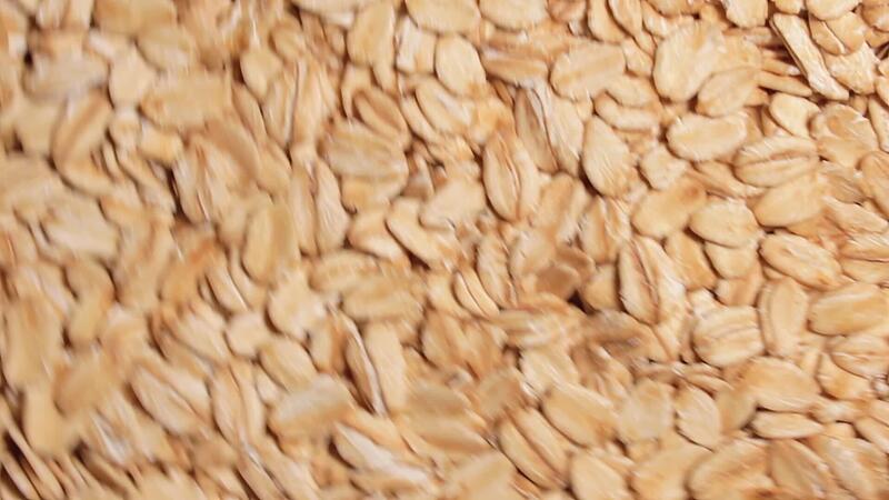Oat Flakes Background Rotating Counter-Clockwise - Top View. Scattered Dry Oat Flakes. Healthy Breakfast and Diet Eating Ingredients - Angular Rotation Left Pro Video