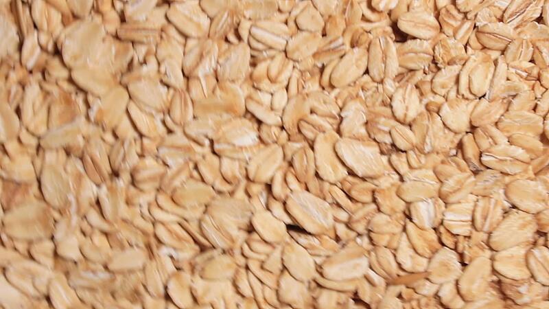 Oat Flakes Background Rotating Clockwise - Top View. Scattered Dry Oat Flakes. Healthy Breakfast and Diet Eating Ingredients - Angular Rotation Right Pro Video