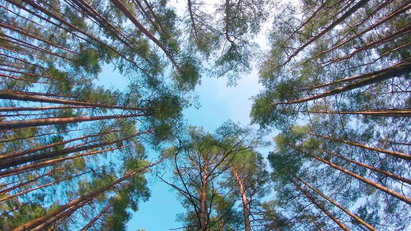 Low Angle View of Colorful Summer Pine Forest, Walking Through the Coniferous Trees - Rotating Left. Bottom View of the Tops of Pines at Sunny Summer Day. The Sky Can Be Seen Through the Tops of Pines Pro Video