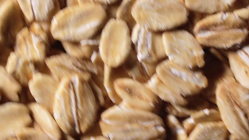 Oat Flakes Background Rotating Clockwise - Top View, Close-Up, Low Key Light. Scattered Dry Oat Flakes. Healthy Breakfast and Diet Eating Ingredients - Angular Rotation Right Pro Video