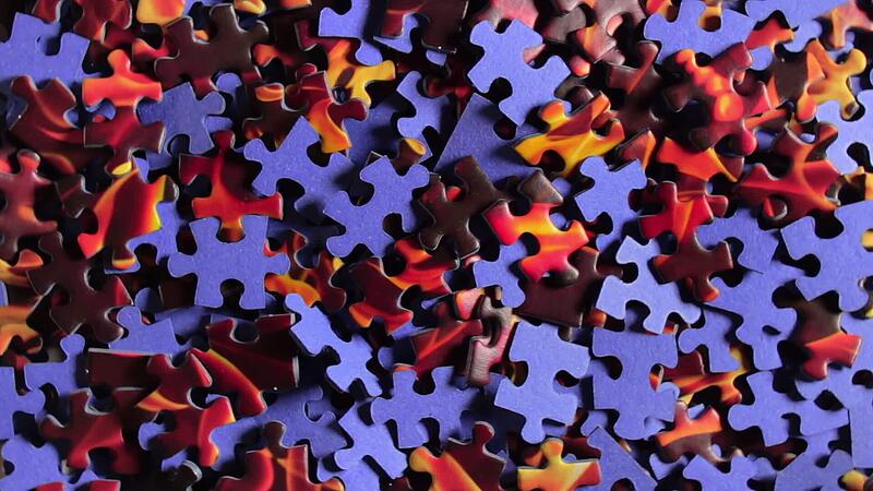 Background of Colored Puzzle Pieces that Slowly Rotating Counterclockwise - Top View. Texture of Incomplete Red and Blue Jigsaw Puzzle - Left Rotation Pro Video