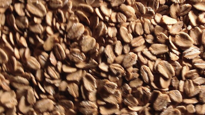 Oat Flakes Background Rotating Clockwise - Top View, Low Key Light. Scattered Dry Oat Flakes. Healthy Breakfast and Diet Eating Ingredients - Angular Rotation Right Pro Video