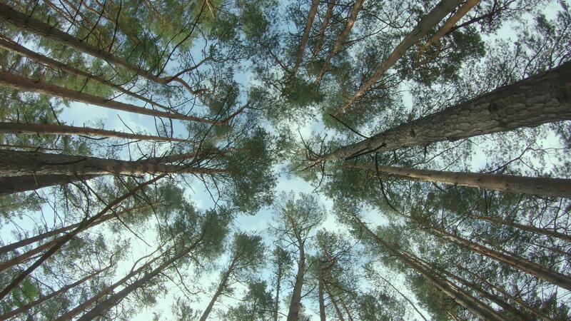 Low Angle View of a Pine Forest when Looking Up to the Trees. Bottom View of Pine Crowns at Sunny Summer Day. The Sky Can Be Seen Through the Tops of the Trees. Gimbal Stabilizer Rotation to the Left Pro Video