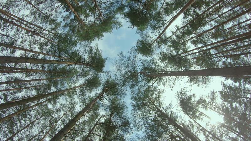 Low Angle View of a Pine Forest when Looking Up to the Trees. Bottom View of Pine Crowns at Sunny Summer Day. The Sky Can Be Seen Through the Tops of the Trees. Backward Gimbal Stabilizer Movement Pro Video