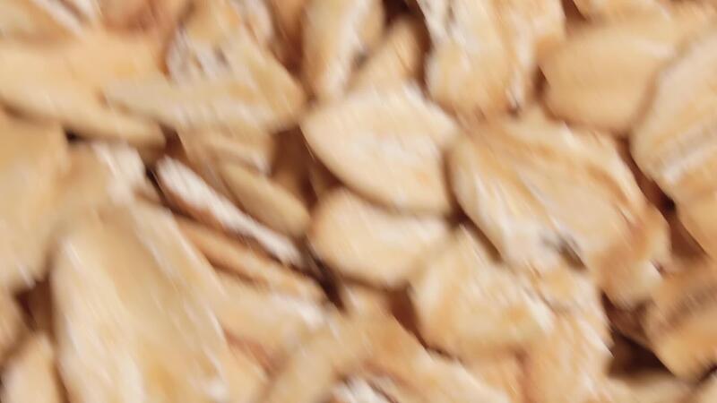 Oat Flakes Background Rotating Clockwise - Top View, Close-Up. Scattered Dry Oat Flakes. Healthy Breakfast and Diet Eating Ingredients - Angular Rotation Right Pro Video