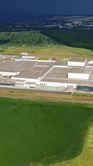 Aerial view from afar on manufacturing complex. Large industrial territory surrounded by green fields and forests in summer. Camera moves down. Vertical Pro Video