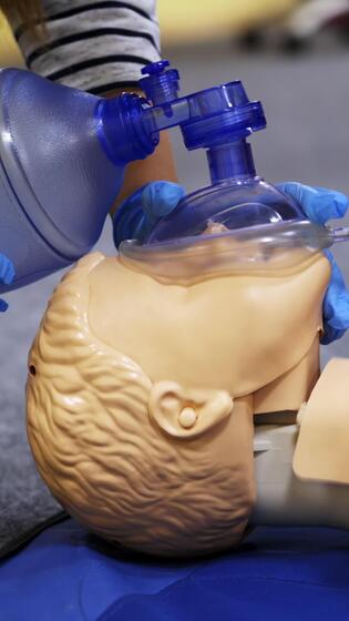 Training course on a manikin. Practitioners giving breath exercises on a dummy at resuscitation. Compression during heart attack on a mannequin. Vertical Pro Video
