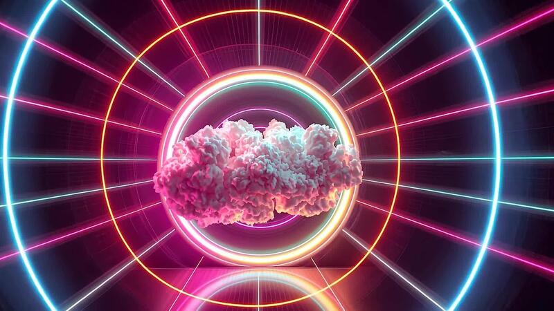 Futuristic Neon Tunnel with Floating Cloud. A surreal glowing neon tunnel surrounds a floating pink cloud, creating a vibrant futuristic atmosphere. Pro Video