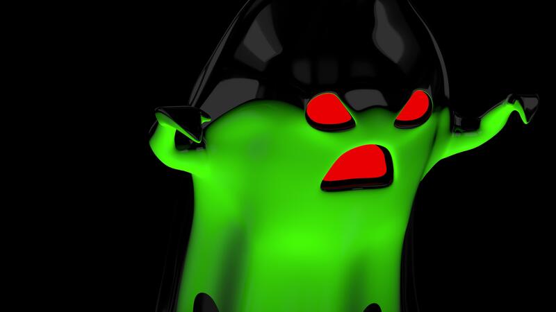 Friendly little white cartoon ghost transforms into scary red mouth and eyes ghost with green light against transparent background. Loop sequence. 3D Animation Pro Video