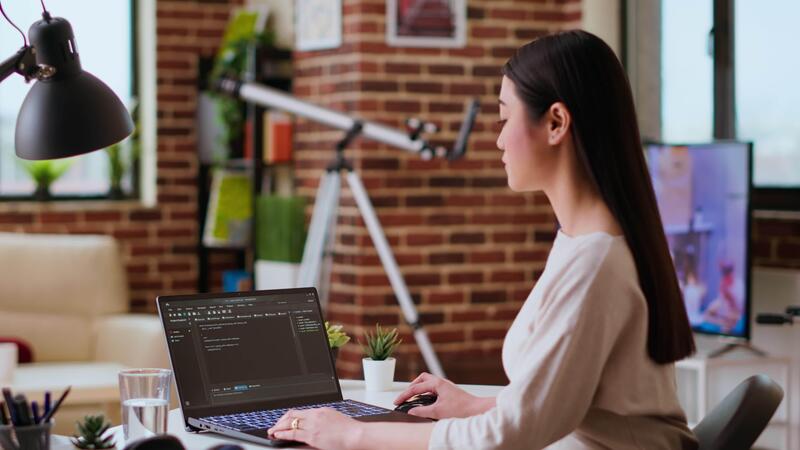 Asian freelancer woman works on programming code in a modern office at home, using her laptop for computer science. IT specialist supports coding, web development and digital innovation. Camera B. Pro Video
