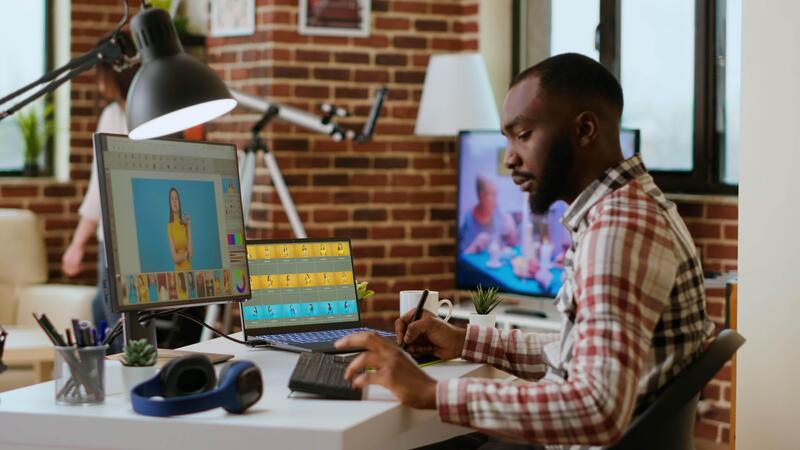 Freelance creative graphic editor works remotely editing digital images in his home office setup. Working with professional software tools and techniques on artistic design. Camera B. Pro Video