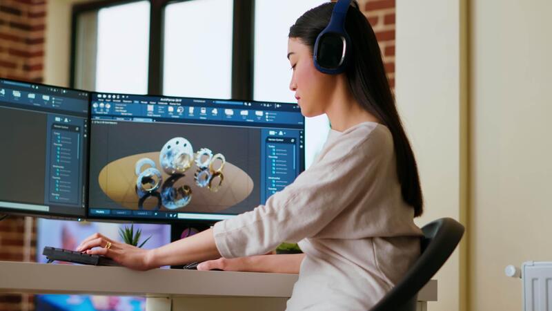 Asian industrial designer puts headset on and works with 3D rendering software, creative freelance tasks. Using dual monitors to enhance multitasking and efficiency for design projects. Camera B. Pro Video
