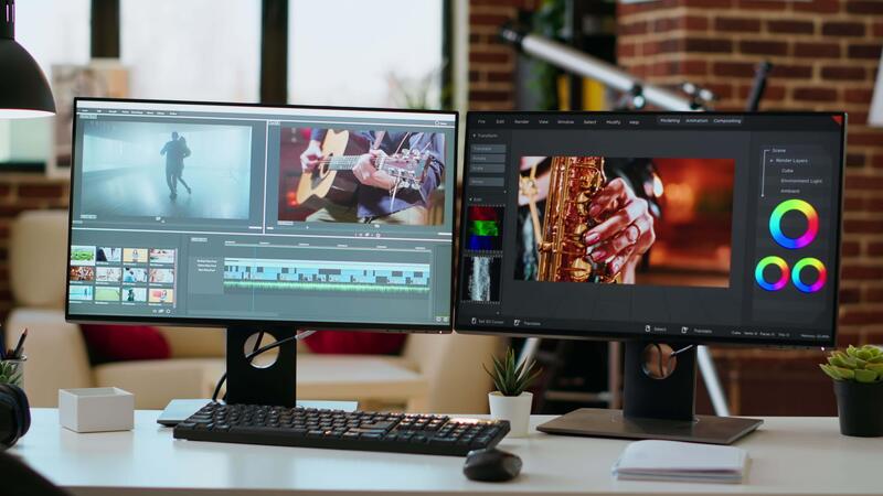 Empty desk in living room featuring dual monitors displaying a project, production. Office setup optimized for remote work with editing software and tech tools for media creation. Pro Video