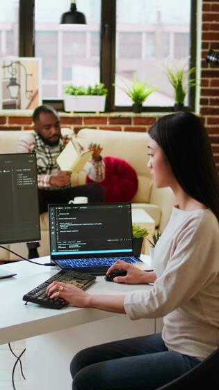 Vertical Asian female developer coding cloud computing applications on pc in a modern tech workspace. Woman IT specialist focuses on the software development process for productivity and innovation. Camera A. Pro Video