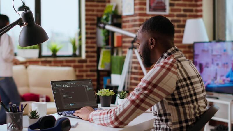African american software developer works on programming code on a laptop in remote workspace. Productive IT engineer working on coding, software design and internet security innovation. Camera B. Pro Video