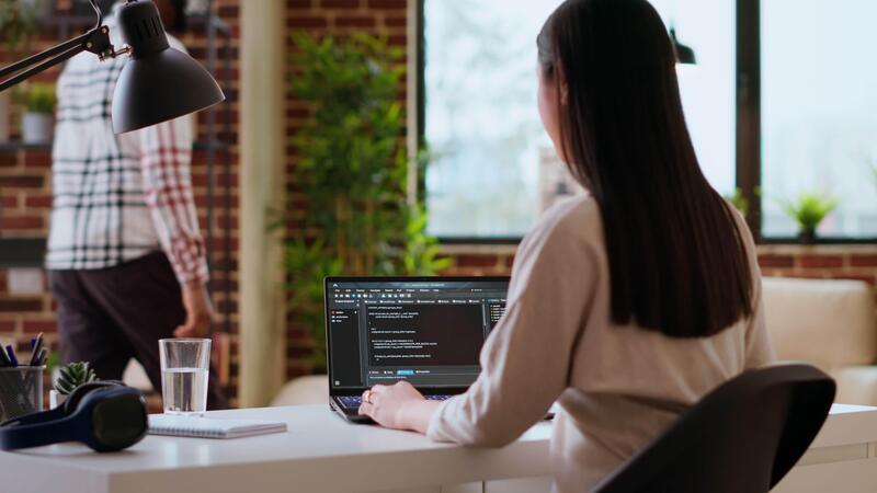 Professional asian software engineer is working remotely typing code on a laptop, using programming language. Woman works on cloud computing, software projects in a digital environment. Camera B. Pro Video