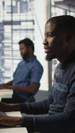 Vertical Admin creating AI machine learning models that can process and analyze data to improve decision making processes, looking at PC. Man programming in office using artificial intelligence tech, camera B Pro Video