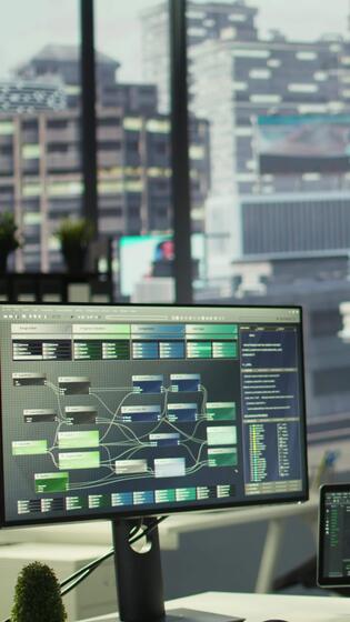 Vertical Empty IT department office used for building AI neural networks software technology. Panning shot of computer monitors in company workspace with nobody in and devices left open on desks Pro Video