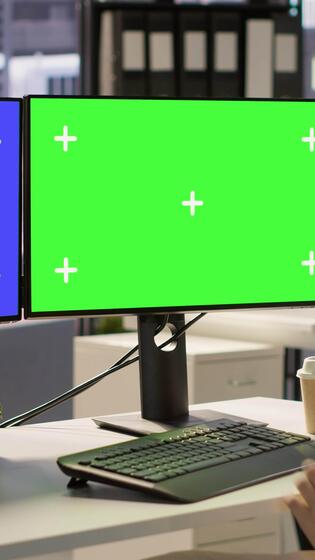 Vertical Employee using multi monitor isolated screen computer to analyze datasets, comparing accounting figures. Woman using chroma key PC to solve tasks for team project, camera A Pro Video
