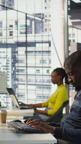 Vertical Happy coworker in wheelchair bumping fists with programmer testing machine learning technology. Person with disability saluting colleague in inclusive office, doing friendly gesture, camera B Pro Video