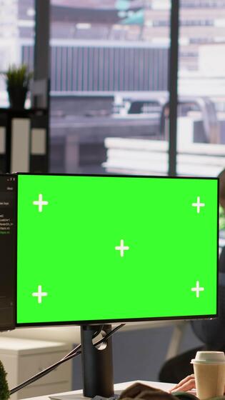Vertical Admin doing software debugging on green screen PC, asking for help from coworker, checking errors in code. Worker fixing coding mistakes on mockup computer, being assisted by colleague, camera A Pro Video