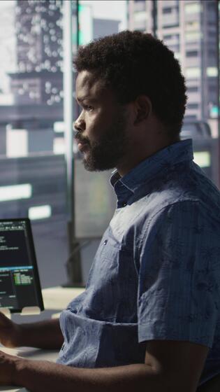 Vertical Data scientist working with machine learning artificial intelligence technology critical to autonomous systems. IT professional working with AI tech to transform data into predictive models, camera B Pro Video