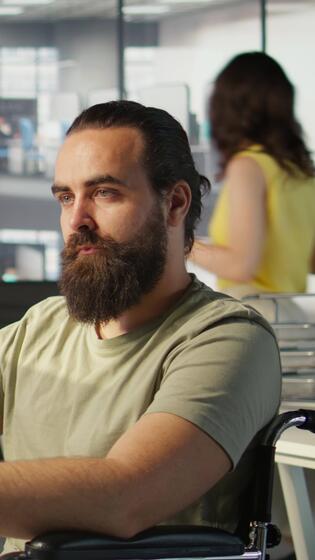 Vertical System administrator with disability in inclusive workspace training machine learning models. IT specialist with paraplegia monitoring and maintaining company systems, camera B Pro Video