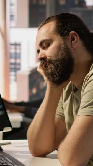 Vertical Fatigued software engineer caught asleep at desk by manager while developing artificial intelligence tech. Team leader waking up lazy worker while training predictive models, camera A Pro Video