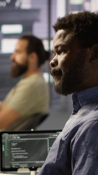 Vertical Programmer waiting for coworker to come help him fix applications issues, dealing with databases and server configuration. IT specialist optimizing company software, assisted by team leader Pro Video