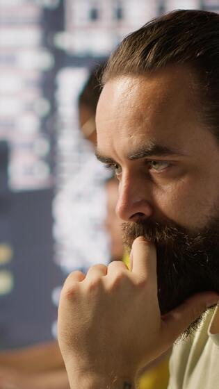 Vertical Pensive employee using computer to analyze datasets, focused on comparing datasets and checking accounting figures. Close up of man concentrating on solving tasks for team project, camera A Pro Video