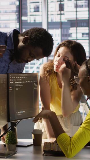 Vertical Upset IT workers in office debating, doing brainstorming, looking through lines of code on computer. Team of company employees discussing in workspace, disagreeing with each other, camera A Pro Video