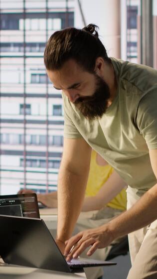 Vertical Admin at office desk utilizing cloud computing resources on laptop to train large scale machine learning models. Man monitoring company systems using notebook while standing in workspace, camera A Pro Video