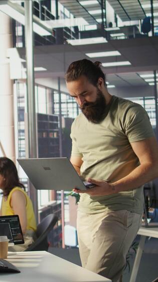 Vertical Admin at office desk utilizing cloud computing resources on laptop to train large scale machine learning models. Man monitoring company systems using notebook while standing in workspace, camera B Pro Video