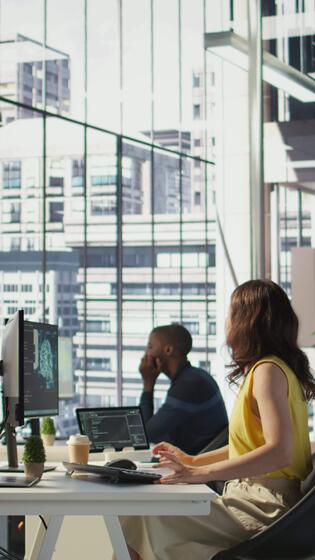 Vertical Manager discussing with employees in office, developing artificial intelligence machine learning APIs. Team leader doing brainstorming with workers, training AI predictive models, camera B Pro Video