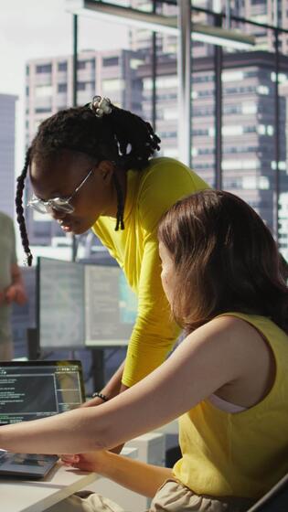 Vertical Admin assisted by coworker while utilizing cloud computing resources to train large scale machine learning models. Woman and colleague monitoring AI company systems using computer, camera B Pro Video