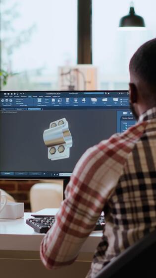 Vertical Engineer designs a turbine in an industrial office using CAD software. Working from home with dual monitors and tools for 3D rendering, boosting productivity and technical precision. Camera B. Pro Video