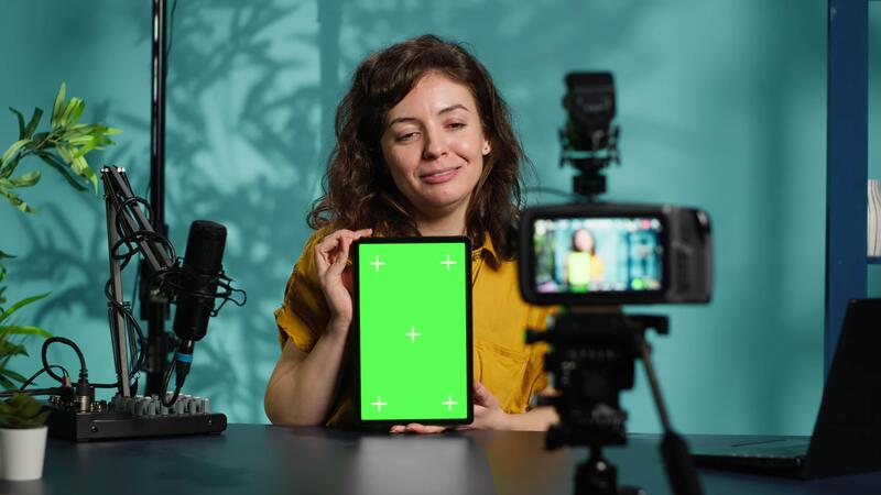 Woman filming tech tutorial on how to repair damaged mockup tablet using professional camera. Engineer teaching fans to install operating system on green screen device, recording with gear, camera A Pro Video