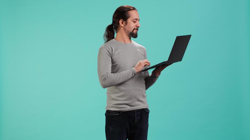 Man using laptop to do business related tasks for company, isolated over studio background. Office clerk doing budgeting, forecasting, and financial analysis on notebook, camera A Pro Video