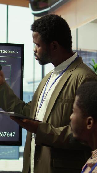 Vertical Coworkers engaging in a problem solving meeting at a corporation, using an interactive board to visualize data and develop solutions for complex challenges. Analysis presentation. Camera B. Pro Video