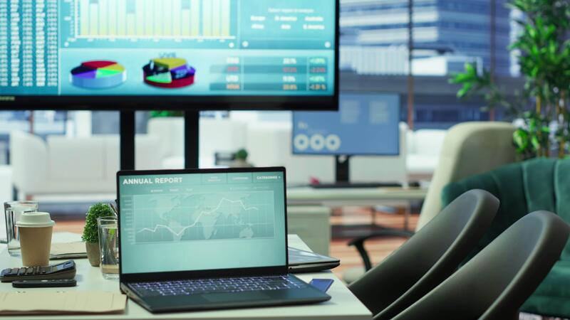 Empty modern office setup with advanced technology enhances productivity, helping professionals focus on financial strategies, performance metrics and global business objectives. Pro Video