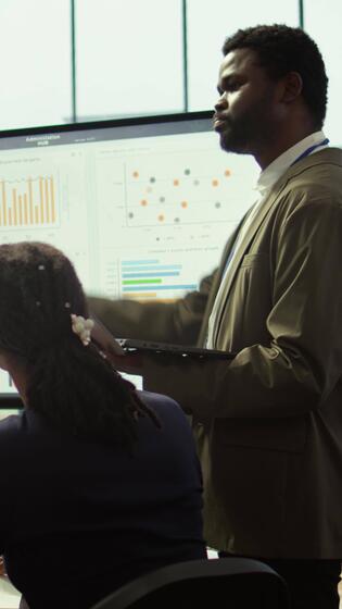 Vertical Team of company analysts reviews feedback on sales and orders to work on improvements, developing marketing and PR strategies in meeting room. Startup enterprise affiliates. Camera B. Pro Video