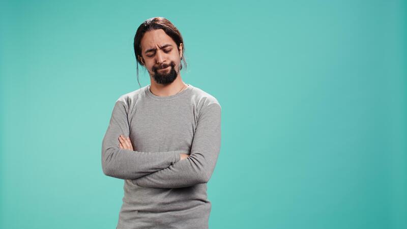 Man shakes head in disbelief, showing lack of satisfaction, isolated over studio background. Disappointed Arab person disagreeing with another person, studio backdrop, camera B Pro Video