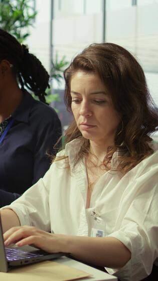 Vertical Team of workers presenting infographics and sales numbers on an interactive board, boardroom activity. Diverse group of professionals engages in a project management meeting for growth. Camera B. Pro Video