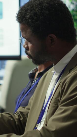 Vertical Shareholder examining infographics and resource allocation on tablet, gathering with associates for a strategy session. Utilizing data analytics to develop innovative solutions for growth. Camera A. Pro Video