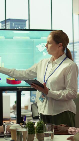 Vertical Group of business associates discussing project development plans, leveraging big data and advanced analytics to make informed decisions and enhance workflow. Multinational company. Camera B. Pro Video